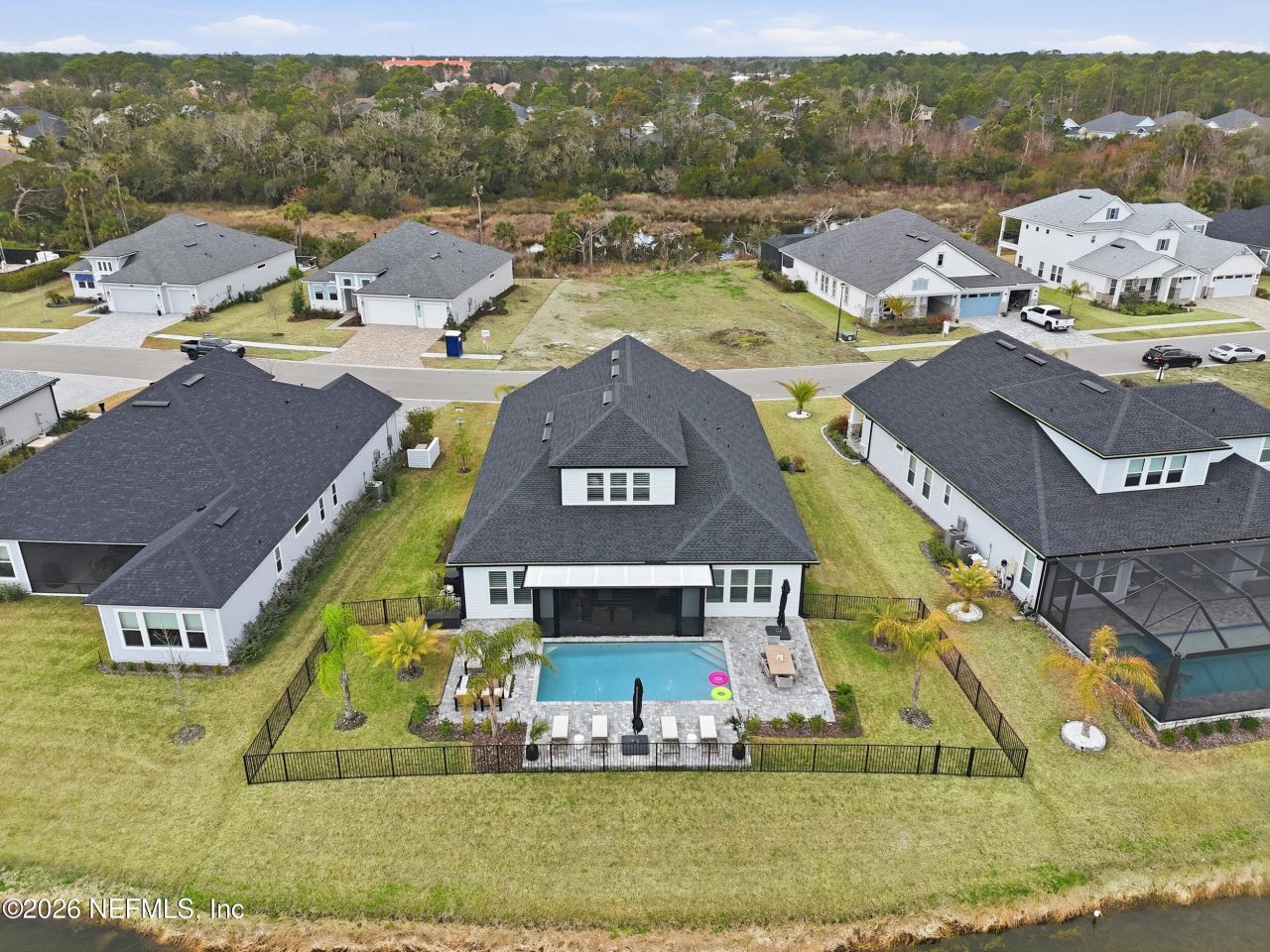 Located in the exclusive Estate Section of the Marshes of Madeira, this exceptional waterfront home offers refined design and resort style living just 2 to 3 miles from historic downtown St. Augustine and minutes to Vilano Beach. Welcome to Mastercraft's Lola model, where the perfect balance of comfort, functionality, and sophistication is found. This thoughtfully designed 4 bedroom, 3.5 bathroom floor plan lives beautifully for both families and empty nesters.Enjoy tranquil sunrise views over the lake and distant views of the lighthouse, beautifully illuminated at night, while embracing the Southern coastal charm that defines life near the Ancient City. Step into resort style living on the expanded lanai, complete with a solid roof pergola with motorized screen, and fully equipped Coyote outdoor kitchen overlooking the heated saltwater pool with water features and extended sun deck. Inside, enjoy 10 foot ceilings, 12 foot sliders, 8 foot solid doors, plantation shutters, upgraded LVP flooring, designer lighting, and abundant storage. The chef's kitchen features a 36 inch gas cooktop, Electrolux appliances, under cabinet lighting, and a separate prep kitchen perfect for entertainers and culinary enthusiasts alike.Additional highlights include a 3 car garage, whole home water softener, smart features, sealed pavers, custom landscaping, and a 230 foot artesian irrigation well. Madeira offers resort style amenities including a pool and fitness center, all within a gated, scenic, walkable community that captures the essence of coastal living.