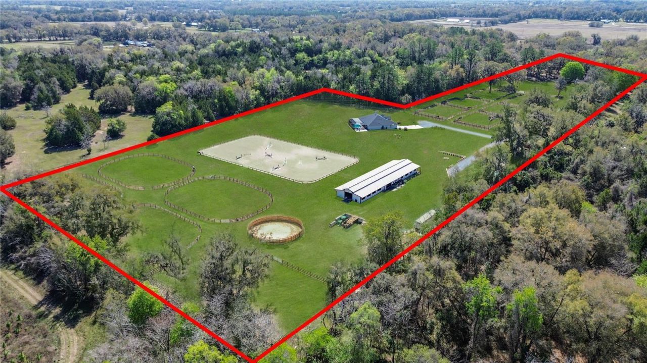 Overlooking 12.45 acres of vibrant Central Florida countryside at the end of a quiet road, this tastefully updated horse farm is well-suited for multiple disciplines. Fenced and gated, the property features a lovely tree-lined drive that leads past multiple paddocks and pastures towards the main portions of the property. Designed with equestrians in mind, the farm features a new center-aisle show barn with 16 custom Saratoga stalls, grooming stalls, tack room, feed room, wash rack, fly spray system, hot water, bathroom, and hay storage, providing a comprehensive setup for horse care and management. 12 paddocks and pastures are in place with board fencing throughout the property, dotted with mature oaks for gentle shade. A 125x145' ebb & flow arena has been established and lovingly maintained, and additional amenities include a round pen, large concrete pad area with RV hookups for long-term guests or seasonal rentals. At the heart of the acreage is the eye-catching 4-bedroom, 3-bath home, which features a brand new roof, a paver driveway and walk-way, covered entry, and mature landscaping. Light and bright, the interior of the home provides over 4,000 sqft of space with an open floor plan and high ceilings throughout. A lovely wood-burning fireplace with mantle acts as the focal point in the living area, perfect for gathering and relaxation. The nearby kitchen is designed for functionality and entertaining with solid wood cabinetry, ample counter space, tiled backsplash, stainless steel appliances, and a large pantry for added storage. Adjacent is a spacious breakfast nook for day-to-day meals or a morning coffee, while the formal dining area is perfectly suited for more formal get-togethers. Each bedroom is warm and inviting, but the primary suite is a true escape with an extra spacious layout, tray ceiling, huge walk-in closet, direct access to the pool area, and a private en-suite bathroom with dual vanities, garden tub, and walk-in shower. Other bedrooms and an additional bonus room provide flexibility for guests, office space, or hobbies as desired. Outdoor living is equally impressive! At the back of the home is a stunning pool area which has been completely screened-in with a new enclosure, with a covered area for shaded seating overlooking the sparkling in-ground pool. An additional concrete patio outside of the enclosure provides additional space for seating, a barbecue area, and much more. A whole-house generator is in place, providing ease of mind even during Florida's rainier season. Located within Reddick, this farm is just a scenic drive to a variety of show and competition venues throughout the area including Majestic Oaks, Sweet Dixie South, HITS, and WEC- all of which are well within a 30 minute drive. Both Ocala and Gainesville are a short commute away, opening up access to a variety of shopping, dining, entertainment, and medical options. If you're dreaming of your slice of Central Florida, this is a wonderful farm with lots of flexibility!