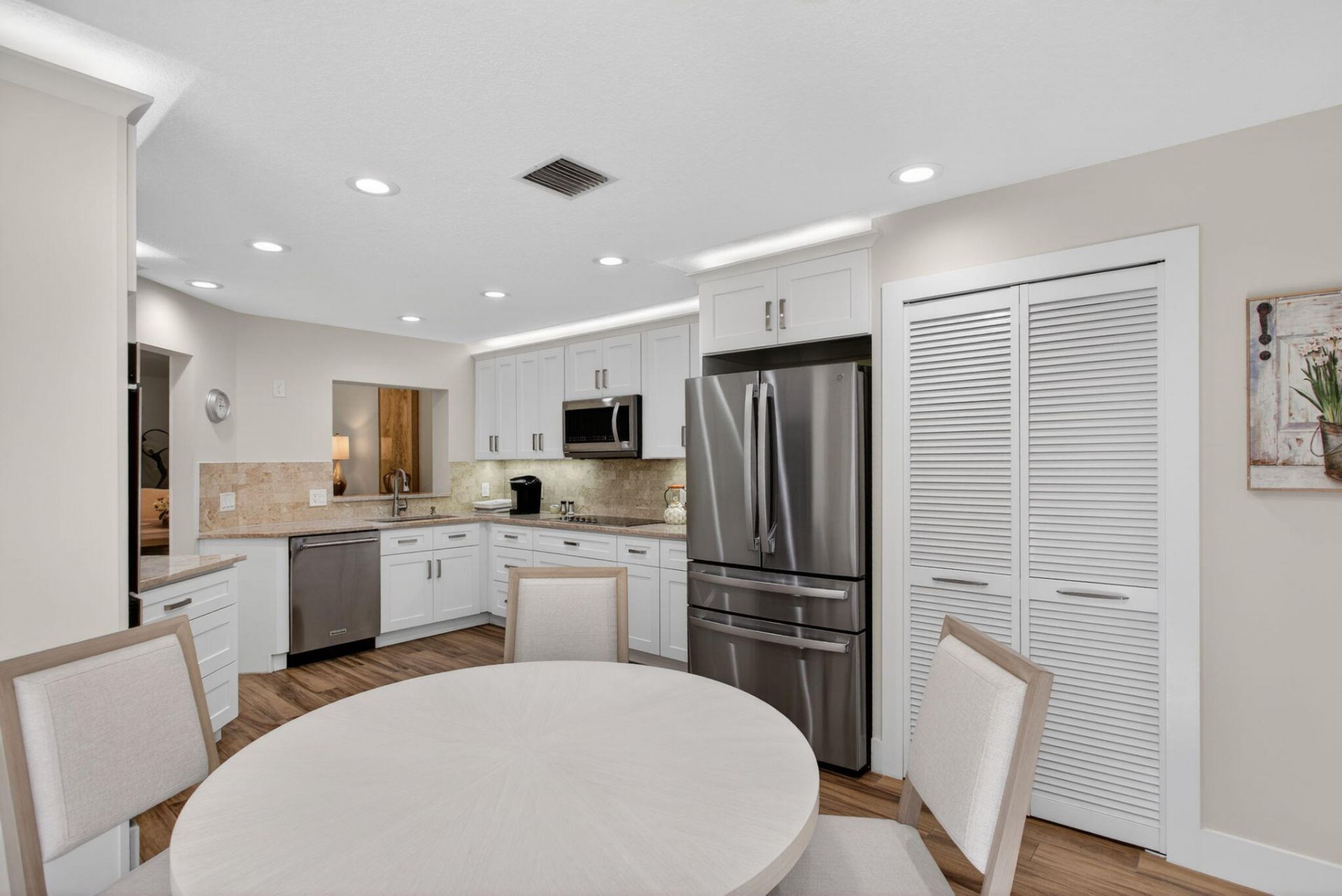 Private courtyard home in the highly desirable Misty Oaks section of Palm Aire offering 2,278 sq ft under air plus garage. Bright interior features a dramatic great room with soaring ceilings, skylights, and elegant staircase creating an impressive open living and dining space filled with natural light. Spacious kitchen with granite countertops, double ovens, breakfast area, and abundant cabinetry. Ground floor primary suite with walk-in closet. Each bedroom has access to its own bath, three ensuite and a fourth just outside the bedroom. Major updates include tile roof (2023), impact windows and doors, Rheem 4-ton A/C, and generator-ready electrical panel. Enjoy indoor outdoor living in the private tiled courtyard and lanai with awning. Community pool and cabana nearby.