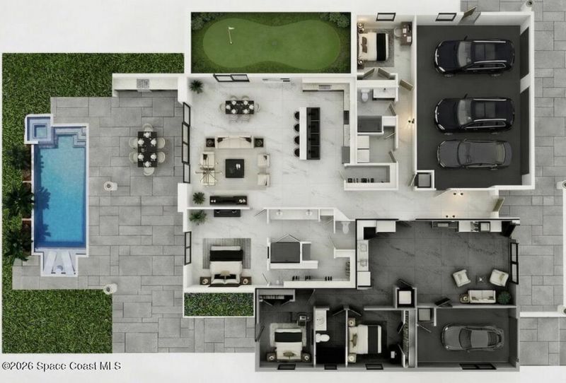 This stunning smart home sits on 1-acre offering the perfect multi-generational living experience with 4 spacious bedrooms and three baths. Enjoy luxurious amenities, including a modern kitchen with quartz countertops, a built-in icemaker, custom cabinets, a hidden coffee bar, and a large walk-in pantry. The main living area features soaring 12-foot ceilings, while the in-laws side has cozy 9.4-foot ceilings. Entertain outdoors with a summer kitchen, propane gas fire pit, sparkling heated pool, and hot tub. Safety is enhanced with IMPACT windows. The home boasts a total of four garages: three on the main side and one for the in-laws suite, with a lift ready for a fifth vehicle. A durable metal roof, double-paned insulated wall and door in the primary bedroom, and tile flooring throughout ensuring comfort and efficiency. The spacious kitchen and living area are perfect for gatherings, while a mini putting green adds recreational fun. This home embodies luxury and family togetherness