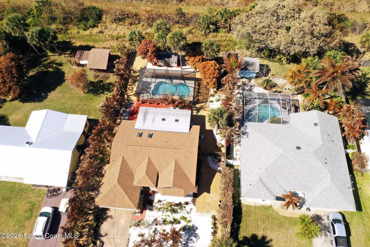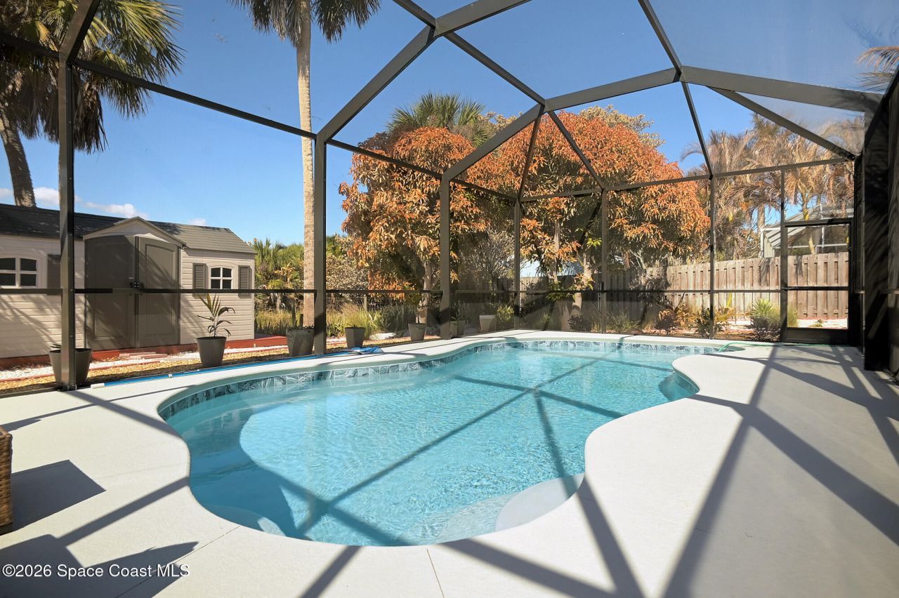 BRAND NEW SCREENED IN POOL INSTALLED NEW IMPACT WINDOWS/ SLIDERS IN 2025. Sold partially furnished this home boasts: A/C 2023 in/out, updated kitchen countertops/backsplash/cabinets refaced. Exterior paint 2024. Super sized outdoor deck in backyard with hot tub. Doll house shed added + 50 tons of landscape gravel distributed in yard. Well pumps/HWH replaced 2024, House exterior painted 2024. As you step inside, the vaulted ceilings and skylights bathe the open-concept floor plan in natural light, creating an inviting atmosphere. Large deck The spacious living area seamlessly flows into the renovated kitchen, ideal for entertaining. Each bedroom is a personal retreat, with large windows framing picturesque views of the surrounding landscape. Fruit trees. Over 100 cacti. 2 garage provides ample storage for beach gear and outdoor equipment.Beyond the home, residents enjoy access to a vibrant community center featuring a clubhouse with restrooms and kitchen + an outdoor playground.