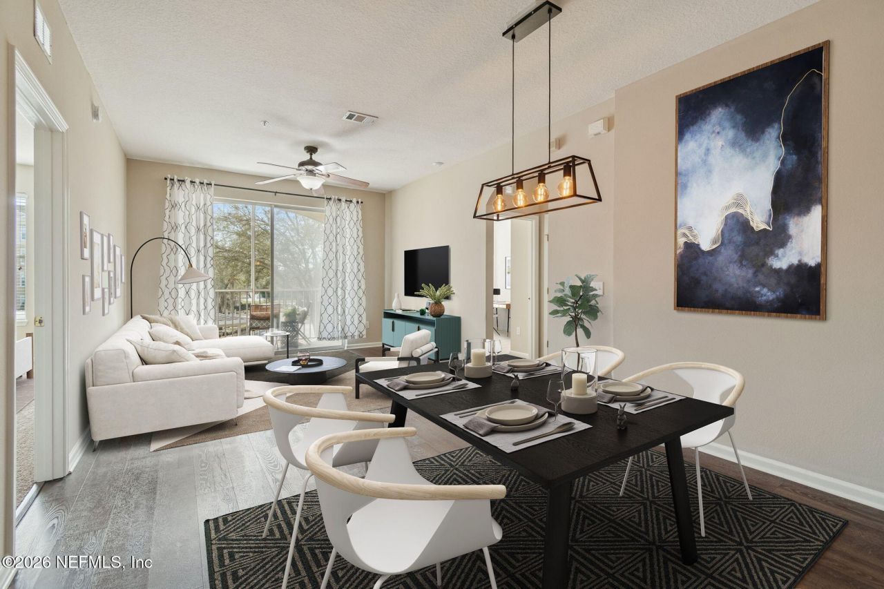 Welcome to Point Meadows Place #5201 - a beautifully maintained end-unit condo offering comfort, convenience, and thoughtful upgrades throughout. Step inside to find luxury vinyl plank flooring in the living and dining areas complemented by fresh interior paint throughout the entire home, creating a bright and inviting atmosphere. The upgraded lighting fixtures and ceiling fans add a modern touch, while large windows enhance the natural light unique to this corner location. The kitchen features a stainless steel appliance package, custom tile backsplash, and ample cabinetry, making meal preparation both stylish and functional. A full-size washer and dryer are included for added convenience. The spacious newly carpeted primary suite offers a private ensuite bathroom with a walk-in shower. The other two bedrooms are on the opposite side of the home for added privacy. Enjoy relaxing mornings or evenings on the covered, screened lanai. Additional highlights include an upgraded keyless entry, Ring video doorbell, and elevator access within the building. Don't forget to visit the amenities center, featuring the clubhouse, outside covered dining, fitness center and a resort style pool! This home offers everything you could want, all in a fantastic location! Point Meadows Place is situated in Jacksonville's Southside and is a centrally located, sought-after gated community, convenient to St. Johns Town Center, JTB, I-295, Mayo Clinic, UNF and the beaches. Don't miss this opportunity to own this perfect blend of comfort and style!Features and Upgrades:*Luxury Vinyl Plank Flooring in Living/Dining Area*Fresh Interior Paint 2026 *Covered Screened Lanai*Upgraded Lighting Fixtures and Ceiling Fans*Stainless Kitchen Appliance Package *Custom Tile Backsplash and Gooseneck Faucet in Kitchen*New Carpet in Primary Bedroom 2026*End-Unit*Primary Ensuite Bathroom with Rain Shower Head*New A/C System 2020*Washer and Dryer Included*Ring Video Doorbell*Upgraded Keyless Entry*Elevator in Building*Assigned Covered Parking Space Included!*HOA Includes Lawn Maintenance and Water*Luxury Gated Community with Pool, Fitness Center, and Clubhouse!Convenient to St. Johns Town Center, The Block, Ikea, Beaches, Publix, V's Pizza, and more!