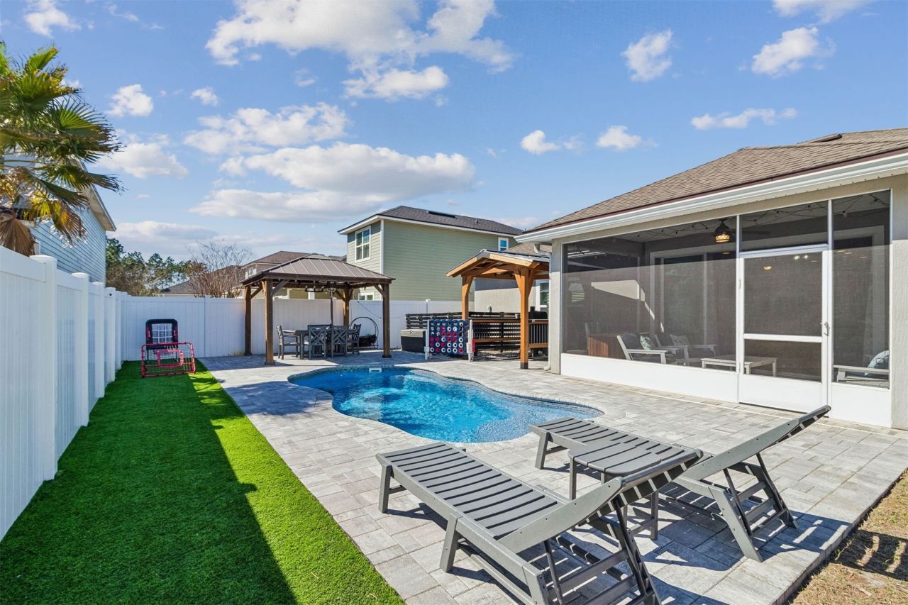 Tucked away in a PRIVATE DOUBLE CUL-DE-SAC neighborhood surrounded by mature TREES, this well appointed 4-bedroom, 2-bath home offers the perfect blend of comfort, curated design, and coastal convenience. Situated on a desirable CORNER lot, this home welcomes you with charming CURB APPEAL and thoughtful layout throughout. Inside, enjoy ACCENT WALLS with FRESH PAINT and LUXURY VINYL PLANK flooring that flows seamlessly through the main living areas, complemented by an UPGRADED KITCHEN featuring stylish finishes and a functional layout for everyday living and entertaining. The living room is anchored by a coastal TILED FIREPLACE with CUSTOM BUILT-IN bookshelves, creating a warm and inviting focal point. Both bathrooms have a fresh, MODERN feel. Step through the TRIPLE POCKET SLIDER into your own BACKYARD RETREAT featuring a SALTWATER POOL, expansive PAVER PATIO, TILED SCREENED PORCH, ASTROTURF play area, and multiple covered ENTERTAINING areas?perfect for relaxing, hosting friends, or enjoying Floridas year-round sunshine. The fully FENCED yard offers privacy while still feeling open and serene. Located just minutes from Amelia Islands pristine beaches, with convenient access to shopping, dining, and top schools, this home is also an easy commute to Kings Bay Naval Submarine Base. The quiet, tucked-away setting paired with unbeatable location makes this property truly special. This is Florida living at its best?peaceful, polished, and perfectly positioned. Schedule your private showing today.